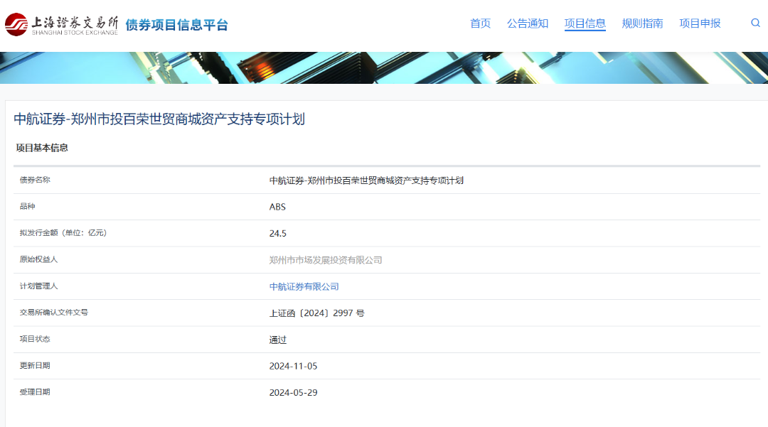 鄭州市投百榮世貿(mào)商城資產(chǎn)支持專項計劃獲上交所通過
